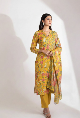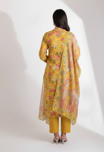Introducing a chic 3-piece printed Lawn suit in vibrant Mustard Yellow, perfect for a bright statement. The straight-cut shirt features an all-over large floral print in shades of pink, green, and white. Paired with solid Mustard Yellow trousers and a striking multi-colored printed dupatta with geometric patterns, this outfit combines comfort with effortless style ideal for casual daytime gatherings.