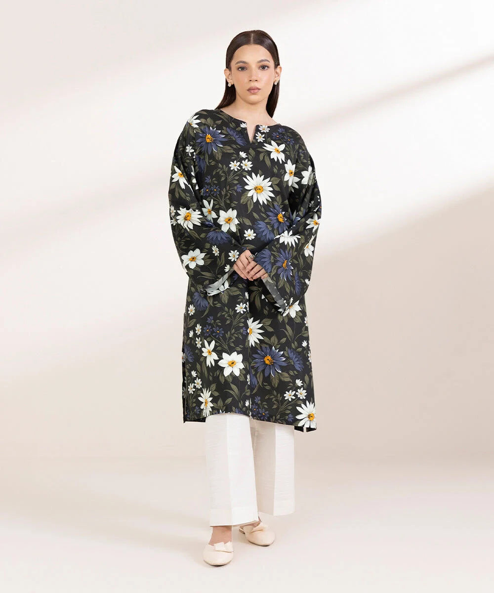 This trendy two-piece Lawn suit is designed for breathable, everyday summer comfort. The straight-cut kurta features a deep forest green or charcoal base with large white and blue daisy-style floral prints, creating a vibrant, fresh look. It is paired with crisp white trousers for a clean contrast. The relaxed silhouette makes it perfect for casual outings and effortless day-to-day wear.