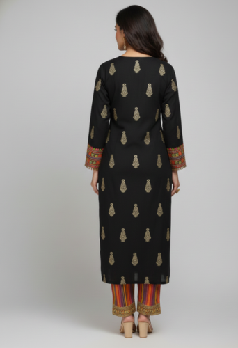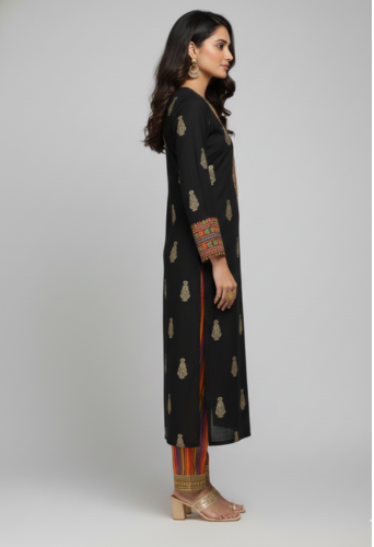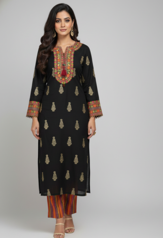 Chic 3-piece suit in luxurious Lawn Jacquard with a sophisticated Black base. The straight-cut shirt features all-over gold or self-toned buti (paisley/mango) motifs and an elaborate gold-embroidered neckline with delicate cuff trim. Paired with solid black trousers and a multi-colored striped dupatta with vibrant pink, orange, and gold accents, this ensemble combines comfort with regal style perfect for semi-formal evening wear or festive gatherings.