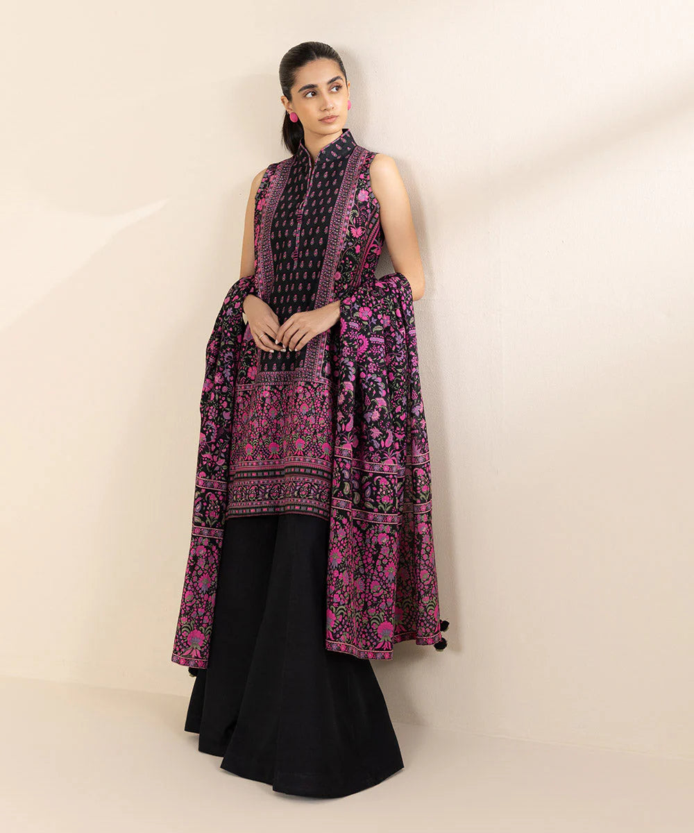 Introducing a chic 3-piece printed Khaddar suit in a bold Black base, designed to make a striking style statement. The straight-cut shirt with attached sleeves features a sophisticated mandarin/ban neckline and rich all-over prints in vibrant pink and magenta tones. Paired with solid black trousers and a stunning, heavily printed Khaddar dupatta, this outfit blends comfort with effortless elegance—perfect for evening wear or refined casual outings.