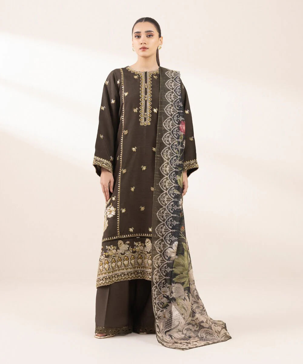 This elegant 3-piece Korean Raw Silk suit comes in a rich Mehndi Green shade with a luxurious fall and subtle sheen. The straight-cut shirt is adorned with intricate gold thread and zari embroidery, featuring delicate floral motifs and a beautifully detailed hemline, neckline, and cuffs. Paired with matching solid trousers, the look is completed with a contrasting digital-printed dupatta in deep tones with hints of ivory, sage, and red, finished with ornate borders. Perfect for formal evenings and festive winter occasions.