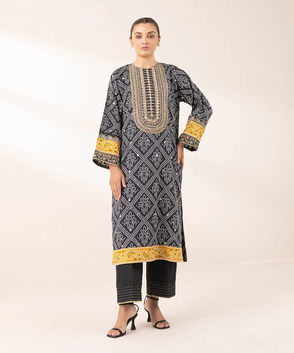 This striking 2-piece Cotton Satin suit in classic black features a straight-cut shirt with intricate white Bandhani-style prints and scattered mirror (Shisha) work. The neckline is richly adorned with gold and black thread embroidery, while mustard yellow and gold borders on the hem and cuffs add a vibrant contrast. Paired with solid black trousers, this ensemble offers a bold, traditional look ideal for cultural events and festive occasions.